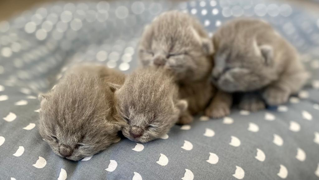 Am 05.03.2022 ging es morgens wie immer mit einem ausgiebigen Frühstück los. Wer hätte gedacht, dass der Tag so aufregend werden würde! Am späten Vormittag legten sich Donna und Nelly gemeinsam in die Wurfkiste, man meint ja, nun ist der verdiente Mittagsschlaf dran! Aber nein, man hat die Wurfkiste befüllt. Still und leise hat Donna ihre Kitten bekommen. Donna schnurrt glücklich und Nelly? Sie liegt daneben und scheint die Abnahme/das Controlling übernommen zu haben. Nachdem bei Donna alles scheinbar zur vollsten Zufriedenheit von Nelly abgelaufen ist, das Personal die Kitten begutachtet und gewogen hat, wird es Zeit, die Kiste weiter zu befüllen. Da ist eindeutig noch Luft. Gegen 17.00 Uhr kommen Nellys Kitten zur Welt, dieses Mal übernimmt Donna die Abnahme/das Controlling. Gegen 20.00 Uhr liegen 8 Kitten, 4 in blue von Donna und 4 in lilac von Nelly in der Kiste. Besonders erwähnenswert findet das Personal die gerechte Aufteilung der Farben. Da die Kitten im Regelfall immer zu zweit in ihre neue Familie gehen, ist es doch toll, zukünftig eine BKH in lilac und in blue sein eigen zu nennen.