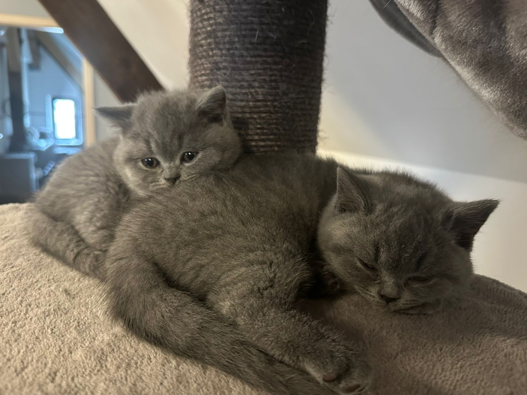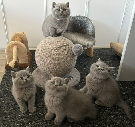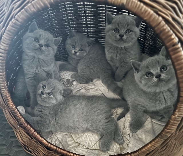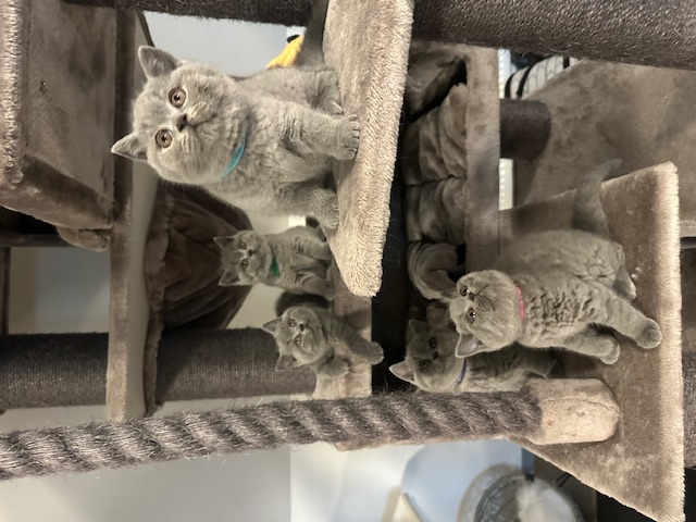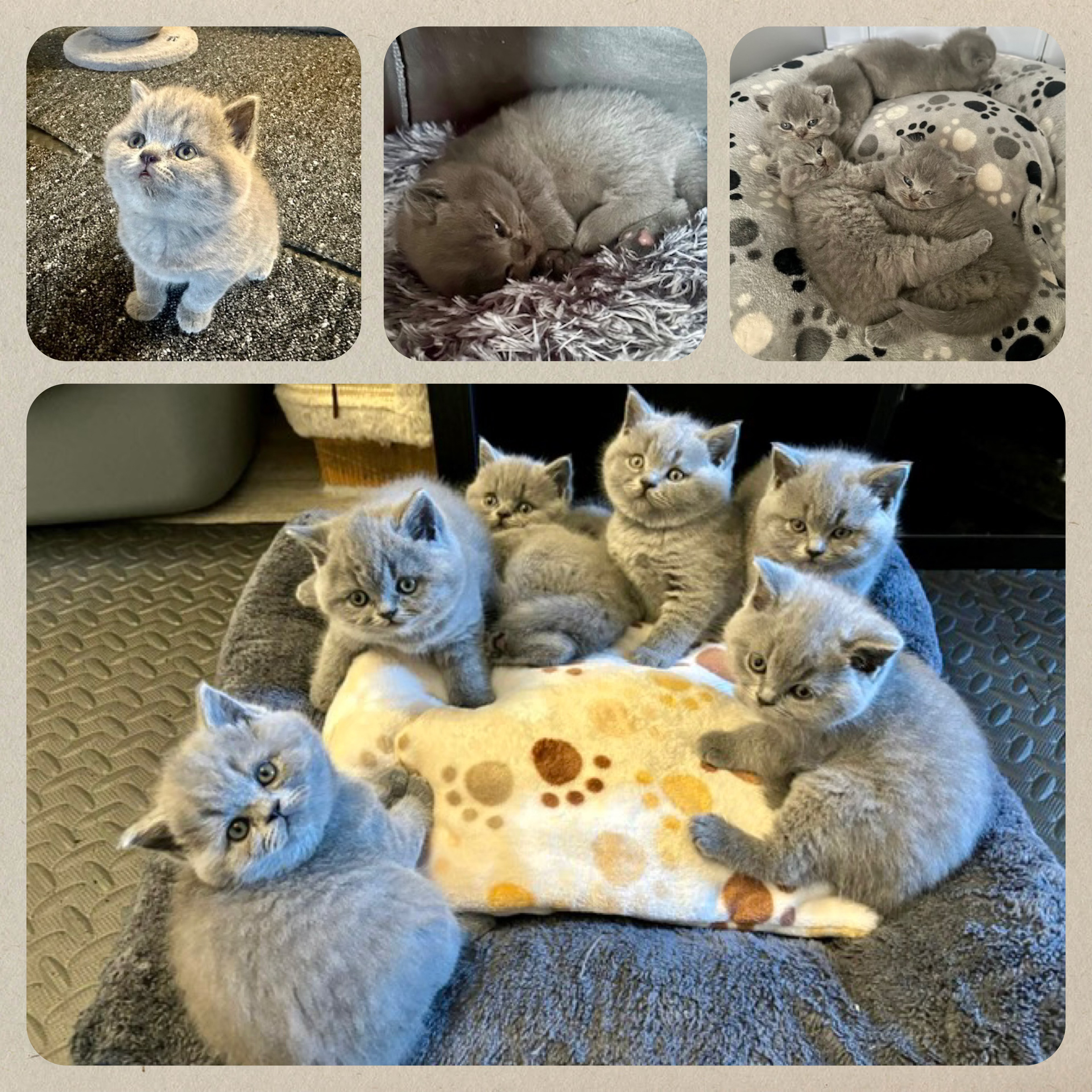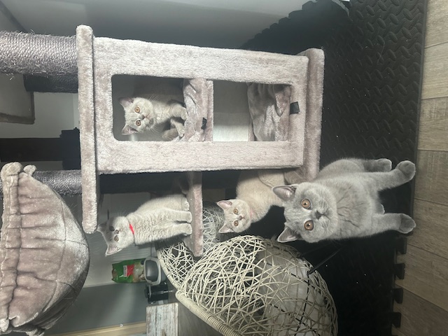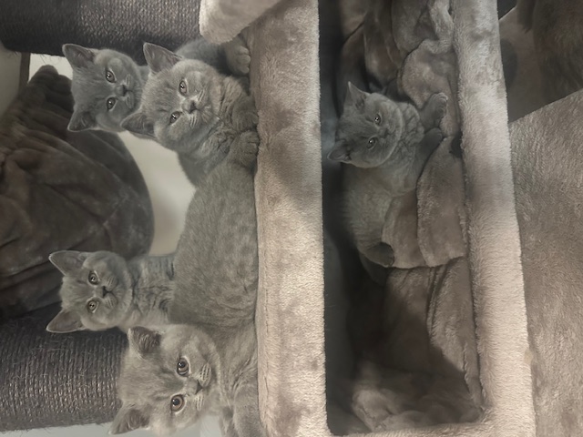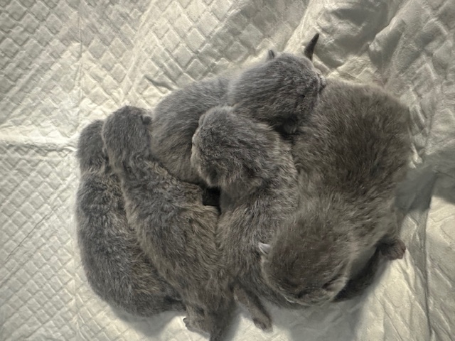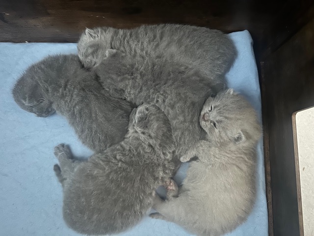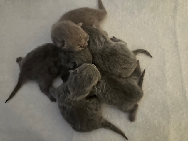 Nachdem der G-Wurf vom 24.05.23 von Nelly ausgezogen ist, ist unsere Donna Mama geworden. Uns soll hier ja nicht langweilig werden und auch die nächsten 3 Monate ist wieder Leben in der Bude. Am 14.09.23 kamen um 9.00 Uhr, 9.17 Uhr, 10.38 Uhr und 12.50 Uhr die Mitglieder unserer H-Truppe zur Welt. Es sind 3 Mädels und 1 Bursche, alle in der Farbe blue. Ein Mädchen ist in einem hellen blue wie Donna, die anderen 3 Kitten haben das dunkle Blue von Giovanni. Die Kitten dürfen ab dem 15.12. ausziehen und verschönern sicherlich das Weihnachtsfest. Bei Interesse bitte melden.