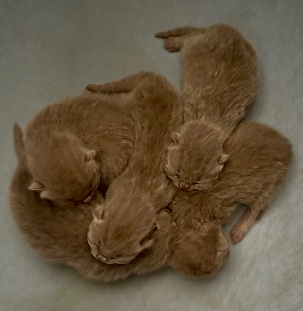 Am 17.06.2024 wurde unser K-Wurf geboren. Es war Ellis erster Wurf, was erfahrungsgemäß immer schwierig ist. Umso genauer haben wir Elli seit Tagen beobachtet, ob es irgendwelche Anzeichen für eine bevorstehende Geburt gibt. Am Abend des 16.06.24 war sie wie immer tiefenentspannt, spielte mit dem Ball und hatte keine Anzeichen, dass irgendetwas passieren würde. In den frühen Morgenstunden des 17.06.24 war dann das Chaos perfekt. Ohne irgendwelche Vorzeichen bekam sie in kürzester Zeit 4 Kitten. Völlig überfordert von der Situation wechselte sie die Lokalitäten und ließ die Kitten liegen. Unsere Aufgabe war es, sie einzusammeln und in die Wurfbox zu bringen. Elli schien förmlich Angst vor den Kitten zu haben und ich stand kurz vor einer Herzattacke. Mit viel Geduld bekamen wir sie in die Wurfkiste und ließen sie vorerst in Ruhe, um sich gegenseitig kennenzulernen und in der Hoffnung, das alles gut wird. Als wir dann um 17.00 Uhr nachschauten, hatte sich doch glatt ein 5. Kitten dazu geschummelt und Elli lag wohlig schnurrend in der Kiste. Alle Kitten tranken und sahen zufrieden aus. Sie wogen zwischen 90 und 127 Gramm und wir denken es sind 4 Jungen und 1 Mädchen. Nun heißt es die Nächsten Tage Daumen drücken, dass alle Kitten wachsen und gedeihen.
